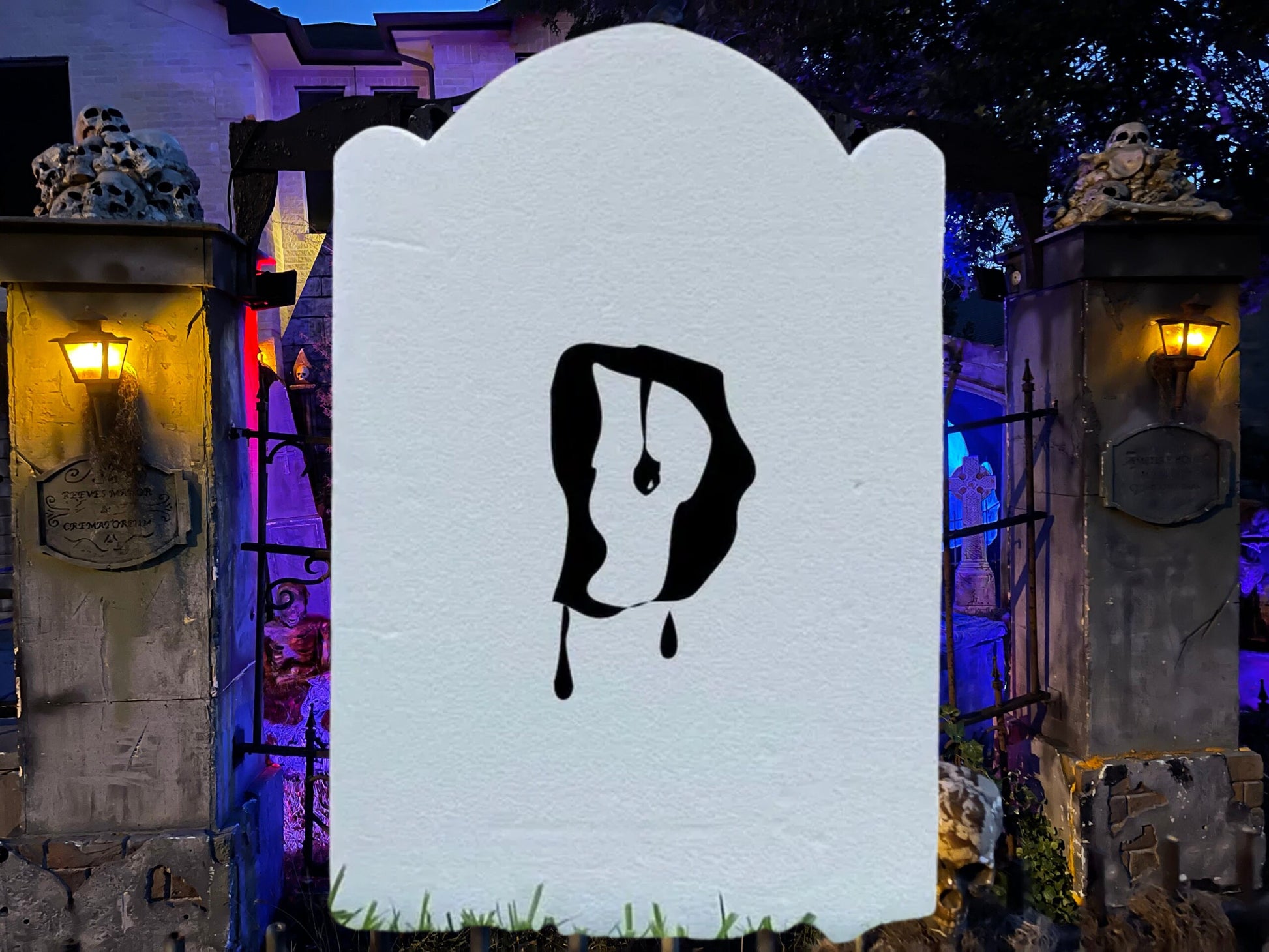 Looking to create your own spooky cemetery for Halloween? Look no further than our tombstone with PVC! Crafted from durable materials, this custom tombstone can be customized with your own unique message or design. The included PVC base makes it easy to install in your haunted house or yard display. With a creepy cemetery scene featuring bats and trees, our tombstone is the perfect addition to any Halloween decor. Get ready to scare your guests with this must-have haunted house accessory!